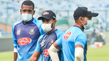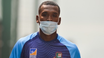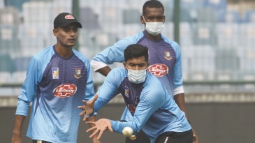 Al-Amin Hossain arrives for a practice session wearing a face mask © AFP