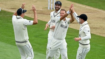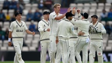 Kyle Jamieson is congratulated by his team-mates after sending back Rishabh Pant © ICC via Getty
