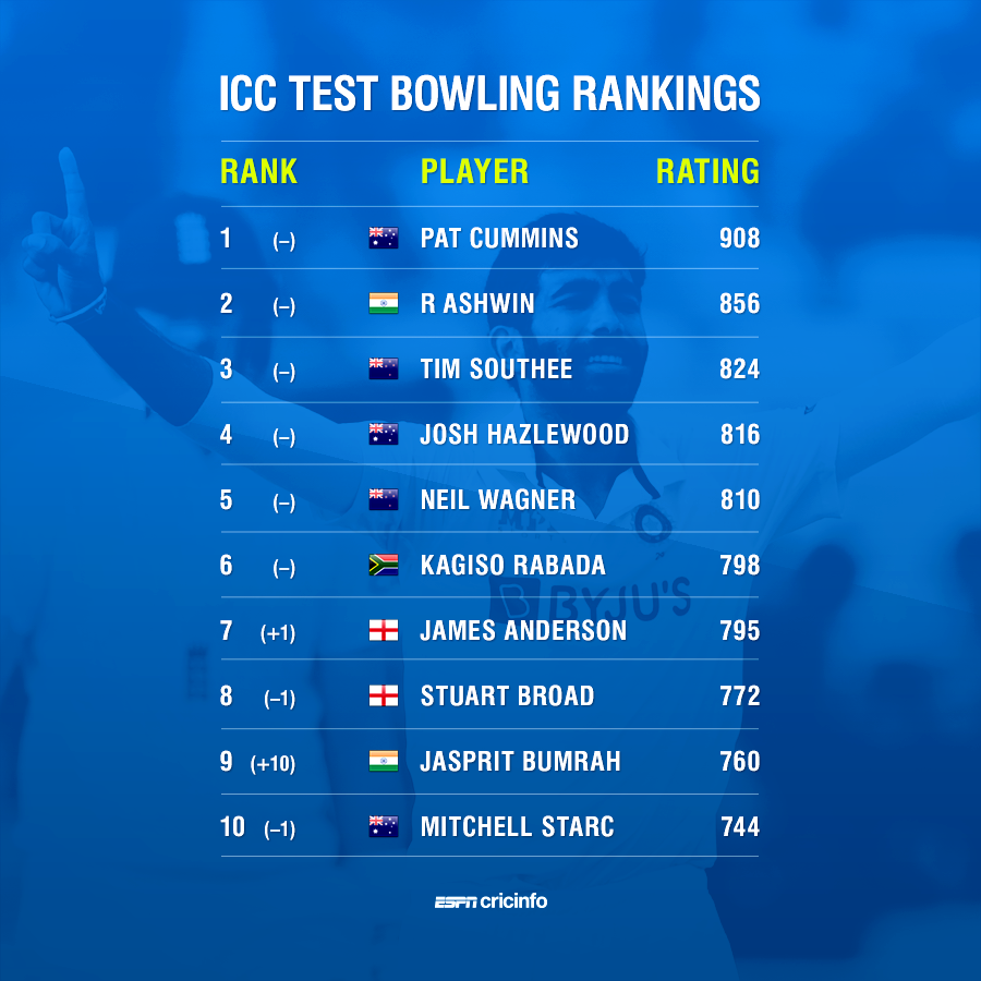 बुमराह ने इस प्रदर्शन के दम पर आईसीसी टेस्ट रैंकिंग में टॉप 10 गेंदबाज़ों की सूची में अपनी जगह बनाने के लिए 10 पायदानों की बड़ी छलांग लगाई है। फिलहाल गेंदबाज़ों की विश्व टेस्ट रैंकिंग में वो 9वें स्थान पर हैं। आपको बता दें कि टेस्ट गेंदबाज़ी में रैंकिंग के मामले में बुमराह सितंबर 2019 में तीसरे पायदान पर थे और यह उनके करियर की सर्वश्रेष्ठ रैंकिंग थी।