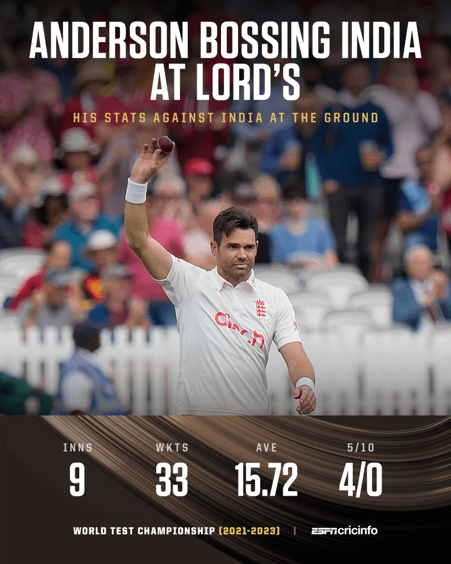 4 बार लॉर्ड्स पर एंडरसन ने भारत के ख़िलाफ़ टेस्ट मैच की एक पारी में पांच विकेट लिए हैं। ऐसा करके वह भारत के खिलाफ एक ही मैदान पर सबसे ज्यादा बार यह कारनामा करने वाले खिलाड़ी बन गए हैं। हालांकि, किसी एक टीम के ख़िलाफ़ एक ही मैदान पर सबसे ज्यादा बार यह कारनामा सिडनी बार्न्स ने ऑस्ट्रेलिया के खिलाफ एमसीजी में पांच बार एक पारी में पांच विकेट लेकर किया है। एंडरसन के आगे अब सिर्फ बार्न्स हैं।