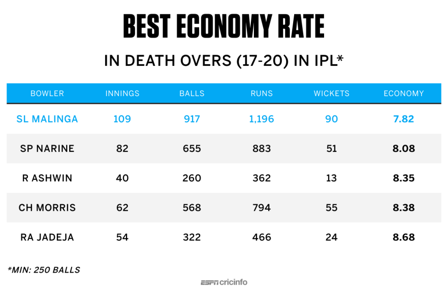 7.82 - आईपीएल खेलते हुए डेथ ओवरों (ओवर नंबर 17-20) में मलिंगा का इकॉनमी रेट इन ओवरों में कम से कम 250 गेंदें डालने वाले 41 गेंदबाज़ों में सबसे बेहतर है। आईपीएल में उन्होंने डेथ में कुल 152.5 ओवर डाले और 1196 रन देते हुए 90 विकेट अपने नाम किए जो टूर्नामेंट में एक रिकॉर्ड है।
