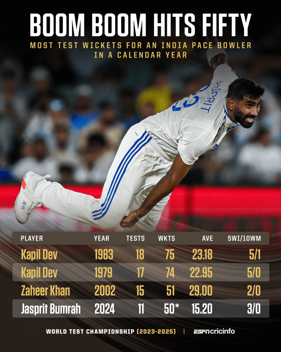 50 बुमराह ने 2024 में टेस्ट में 50 विकेट चटकाए हैं। वह ज़हीर ख़ान (2002 में, 51 विकेट) और कपिल देव (1979 में 74 और 1983 में 75 विकेट) के बाद एक कैलेंडर ईयर में इस उपलब्धि को हासिल करने वाले सिर्फ़ तीसरे भारतीय तेज़ गेंदबाज़ हैं। बुमराह 2019 में पैट कमिंस द्वारा एक कैलेंडर ईयर में 50 से अधिक विकेट लिए जाने के बाद ऐसा कारनामा करने वाले पहले तेज़ गेंदबाज़ हैं।