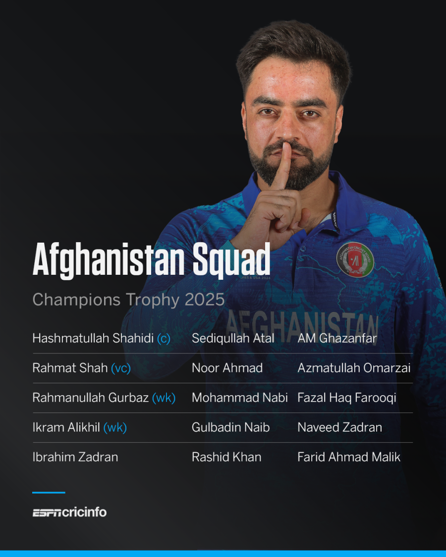 ज़दरान ने उस चोट से उबरने के लिए इंग्लैंड में सर्जरी करवाई थी। उन्होंने वर्तमान में बांग्लादेश प्रीमियर लीग (बीपीएल) में खुलना टाइगर्स के साथ खेलते हुए मैदान पर वापसी की है। एसीबी के अंतरिम मुख्य चयनकर्ता के अनुसार, मिस्ट्री स्पिनर मुजीब उर रहमान "चयन के लिए उपलब्ध नहीं थे," और अफ़ग़ानिस्तान ने उनकी जगह एएम ग़ज़नफर को टीम में शामिल किया है, जो वर्तमान में यूएई की IPL लीग में MI एमिरेट्स के लिए खेल रहे हैं। उन्हें मुंबई इंडियंस ने IPL 2025 के लिए भी चुना है।