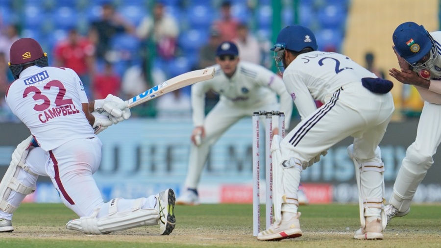 वेस्टइंडीज़ की सलामी जोड़ी ने एक सधी हुई शुरुआत की थी और जॉन कैंपबेल और तेजनारायण चंद्रपॉल की जोड़ी संभलकर बल्लेबाज़ी कर रही थी। हालांकि टी से ठीक पहले कैंपबेल ने जाडेजा की गेंद पर ज़ोरदार प्रहार किया और शॉर्ट लेग पर गेंद साई सुदर्शन के हेलमेट पर लगी लेकिन उन्होंने कैच लपक लिया।