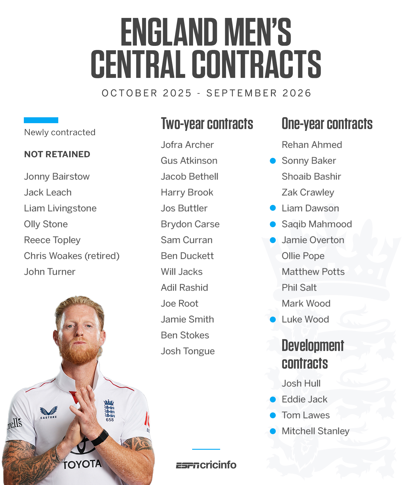 पांच खिलाड़ियों को पहली बार सेंट्रल कॉन्ट्रैक्ट मिला है: सॉनी बेकर, लियाम डॉसन, साक़िब महमूद, जेमी ओवरटन और ल्यूक वुड। वहीं छह खिलाड़ियों को इस बार कॉन्ट्रैक्ट नहीं मिला जिनमें जॉनी बेयरस्टो, जैक लीच, लियाम लिविंगस्टन, ओली स्टोन, रीस टॉपली और क्रिस वोक्स (अंतरराष्ट्रीय क्रिकेट से संन्यास ले चुके) शामिल हैं।