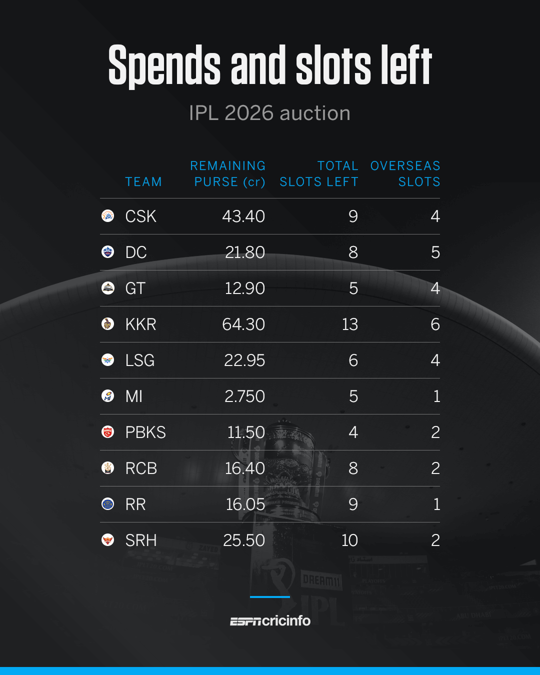 नीलामी में उन्हें क्या चाहिए: पहली पसंद की प्लेइंग इलेवन लगभग तय है। पर्स में ज़्यादा रूपए नहीं बचे हैं तो उनके पास सीमित विकल्प होंगे।