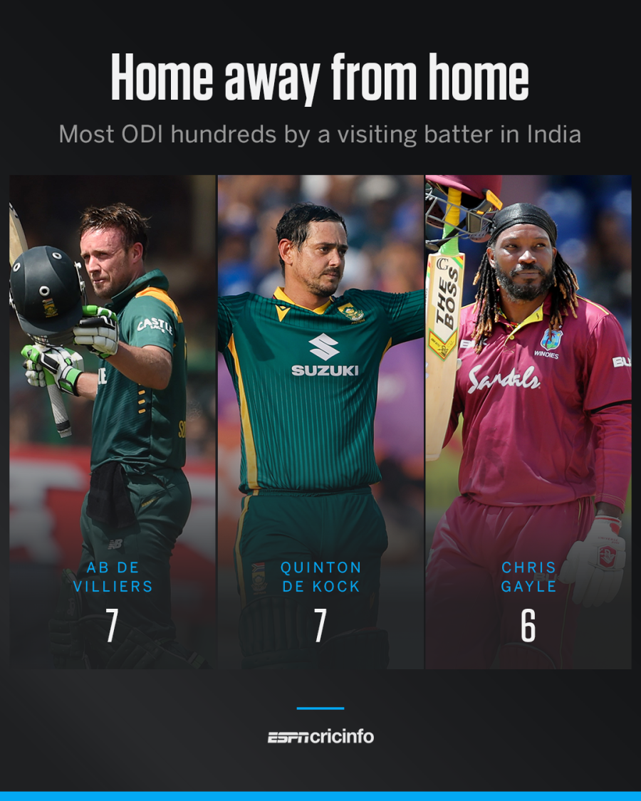 7 क्विंटन डी कॉक ने भारत के ख़िलाफ़ वनडे में सातवां शतक जड़ा जो कि सनत जयासूर्या के साथ संयुक्त रूप से सर्वाधिक शतक हैं। डी कॉक का यह भारत में उनका सातवां वनडे शतक भी था जो कि ए बी डी विलियर्स के साथ संयुक्त रूप से भारत में किसी मेहमान बल्लेबाज़ द्वारा लगाए गए सर्वाधिक शतक हैं। यह घर के बाहर किसी बल्लेबाज़ द्वारा एक देश में लगाए गए संयुक्त तौर पर सर्वाधिक शतक भी हैं, सचिन तेंदुलकर और सईद अनवर ने UAE और रोहित शर्मा ने इंग्लैंड में शतक लगाए हैं। 161 वनडे पारियों में डी कॉक के नाम 23 शतक हैं उनसे कम पारियों में इतने शतक केवल दो बल्लेबाज़ों ने लगाए थे। हाशिम अमला ने 23 वनडे शतकों के लिए 152 जबकि कोहली ने 157 पारियां ली थीं।
