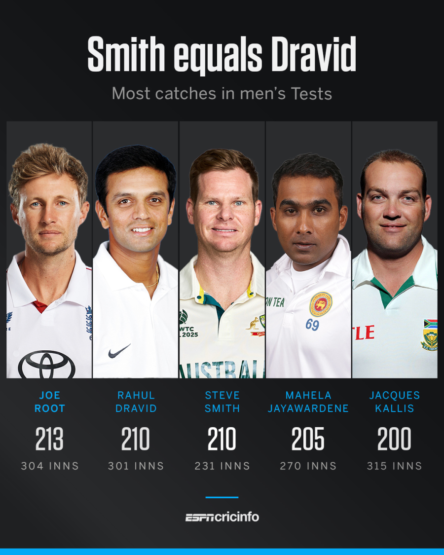 210 - स्टीव स्मिथ ने टेस्ट क्रिकेट में फ़ील्डर के रूप में राहुल द्रविड़ को पीछे छोड़ दिया है और अब दूसरे सर्वाधिक कैच लेने वाले फ़ील्डर बने हैं। गाबा टेस्ट के चौथे दिन स्मिथ ने तीन कैच पकड़े। अब 213 कैच के साथ केवल रूट ही उनसे आगे हैं।