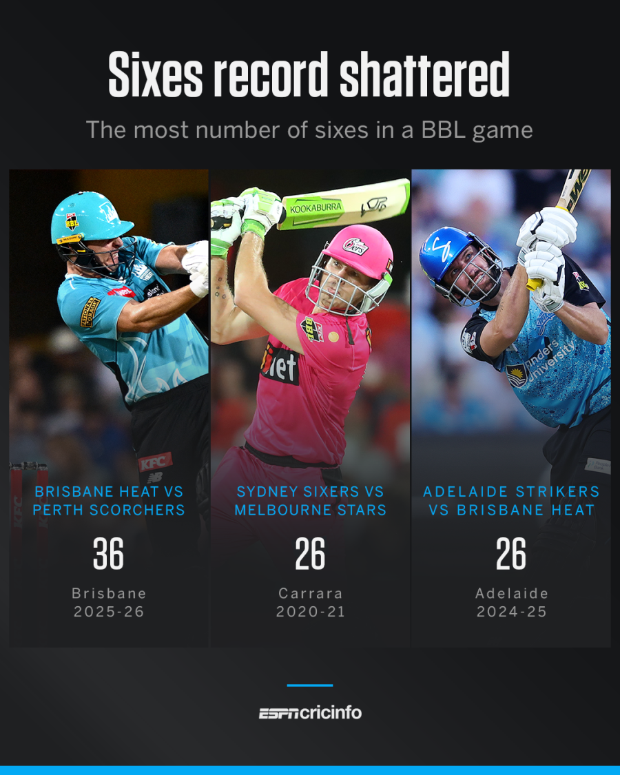 दोनों टीमों ने मिलकर 36 छक्के लगाए और यह भी एक BBL रिकॉर्ड है। इससे पहले दो मौक़ों पर BBL मैच में 26 छक्के लग चुके हैं।