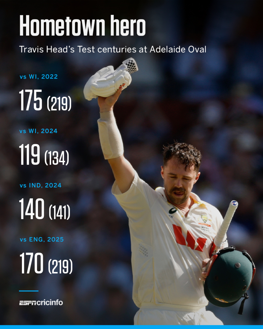 हेड अब ऐडिलेड ओवल में खेले गए अपने आख़िरी चार टेस्ट मैचों में शतक लगा चुके हैं। उनसे पहले इस मैदान पर लगातार चार टेस्ट में शतक लगाने का कारनामा सिर्फ़ माइकल क्लार्क ने किया था।