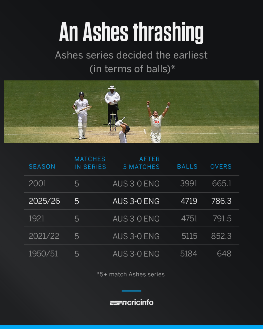 घर में ऑस्ट्रेलिया की इससे लंबी लगातार ऐशेज़ सीरीज़ जीत सिर्फ़ एक बार रही है। 1990-01 से 2006-07 के बीच पांच सीरीज़। दरअसल, 2000 के बाद से ऑस्ट्रेलिया में खेली गई सात में से छह ऐशेज़ सीरीज़ में ऑस्ट्रेलिया ने तीसरे टेस्ट तक 3-0 की बढ़त लेकर सीरीज़ जीत ली है।