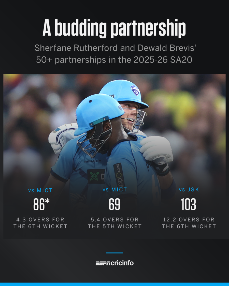 इस सीज़न में ब्रेविस और रदरफ़ोर्ड ने दो और 50 से ज़्यादा रन की साझेदारियां भी की हैं। दोनों ही पांचवें या उससे नीचे के विकेट के लिए थीं। इससे पहले सिर्फ़ नौ जोड़ियां ही पुरुषों के T20 टूर्नामेंट में पांचवें या उससे नीचे के विकेट के लिए तीन या उससे अधिक 50 से अधिक रनों की साझेदारियां कर पाई हैं।