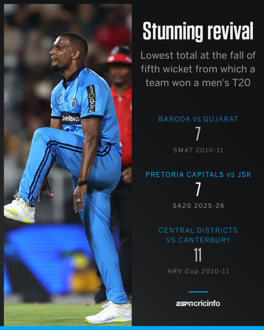 प्रिटोरिया कैपिटल्स (PC) ने शनिवार रात SA20 में एक अदभुत कारनामा किया और वापसी की एक ऐसी कहानी लिखी, जिसे काफ़ी समय तक याद रखा जाएगा। PC की टीम ने पावरप्ले के दौरान महज सात रन पर पांच विकेट गंवा दिया था। इसके बाद शरफ़ेन रदरफ़ोर्ड और डेवॉल्ड ब्रेविस ने टीम को 143 के स्कोर तक पहुंचाया। फिर आगे की दास्तान गेंदबाज़ों ने तय की और जोबर्ग सुपर किंग्स (JSK) को 122 के स्कोर पर रोक दिया।।
