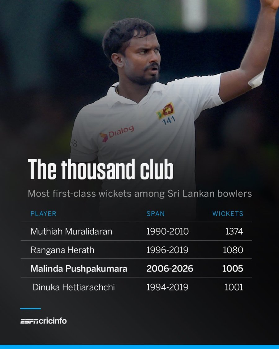 सोमवार को श्रीलंका के मालिंडा पुष्पकुमारा प्रथम श्रेणी क्रिकेट में 1000 विकेट लेने वाले 218वें खिलाड़ी बने। हालांकि 21वीं सदी में यह उपलब्धि अब भी बेहद दुर्लभ मानी जाती है। उनके इस कारनामे से जुड़े कुछ अहम आंकड़ों पर एक नज़र।