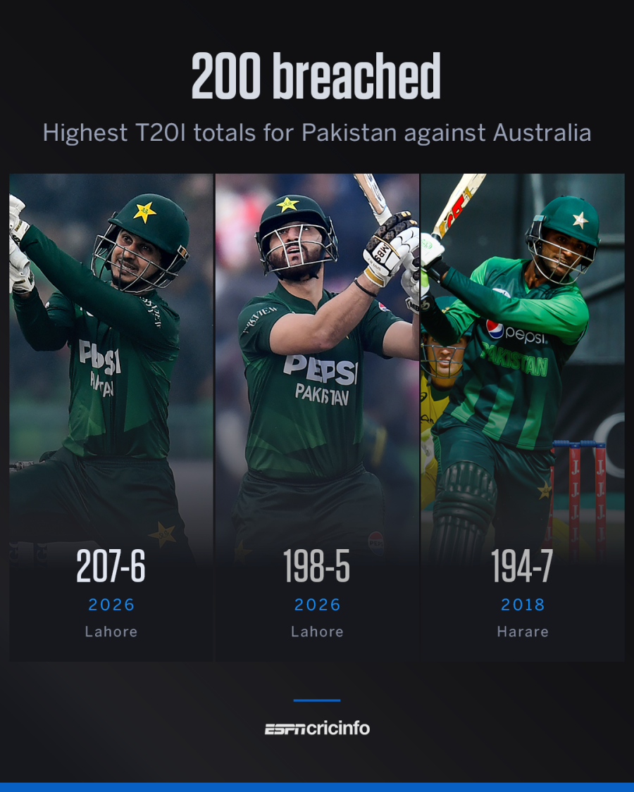 207/6 - रविवार को ऑस्ट्रेलिया के ख़िलाफ़ तीसरे मैच में पाकिस्तान का स्कोर 207/6 था। यह T20I में ऑस्ट्रेलिया के ख़िलाफ़ उनका पहला 200 से ज़्यादा का स्कोर था। पाकिस्तान का पिछला उच्चतम स्कोर 198/5 था, जो शनिवार को दूसरे मैच में बना था। इस सीरीज़ से पहले, ऑस्ट्रेलिया के ख़िलाफ़ उनका उच्चतम स्कोर 2018 में हरारे में 194/7 था।