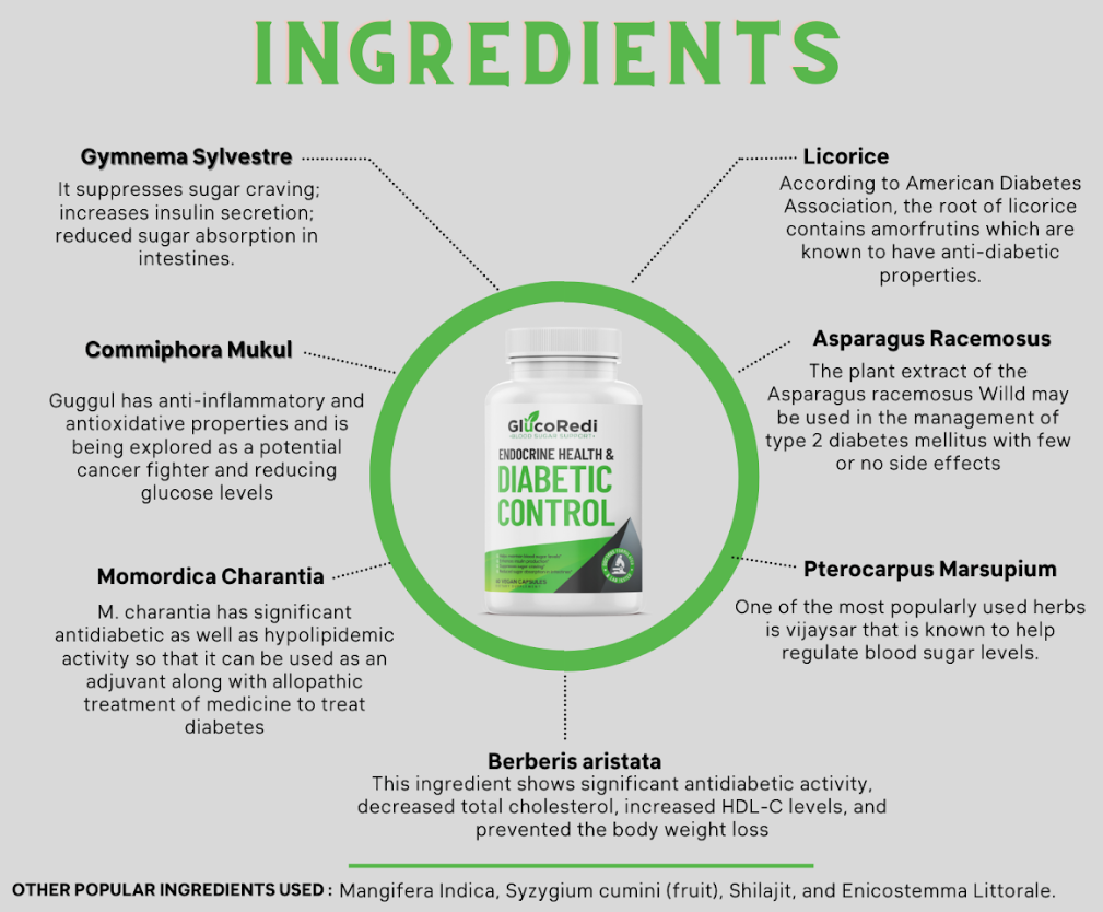 ● It reduces complications associated with diabetes. High blood glucose can harm organs and tissues throughout the body, leading to complications like heart disease, stroke, kidney disease, and blindness. GlucoRedi may reduce the risk of these complications by helping to lower blood sugar levels.