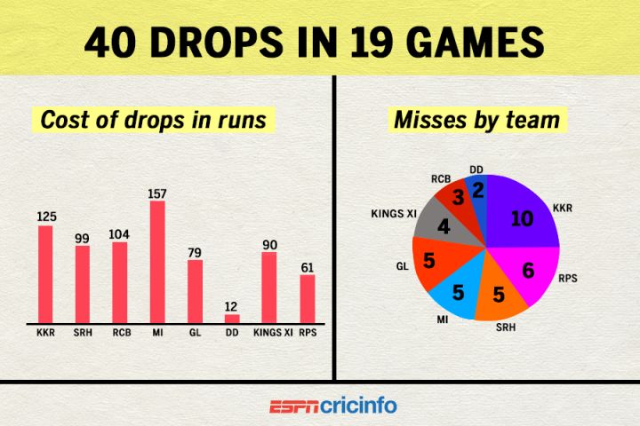There have been 40 dropped catches in the first 19 games of the IPL, which have cost a total of 727 runs. Here's a list of all of them.