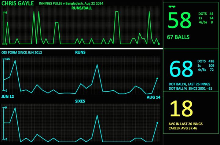 2 Number of 40-plus scored scored made by Gayle in his last 25 ODI innings. Apart from the 58 in this game and his 109 versus Sri Lanka at Kingston in June 2013, the top score from his other 23 innings is 39. Gayle has scored only 465 runs during this period at a dismal average of 18.60 and an unlikely strike rate of 78.15.