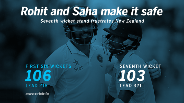 4 Century partnerships for India for the seventh wicket in last five Tests at Eden Gardens. Before Rohit Sharma and Wriddhiman Saha added 103 runs in the second innings of this Test, Rohit and R Ashwin had shared 280 runs for the same wicket against West Indies in the last Test here. MS Dhoni and VVS Laxman had shared partnerships of unbeaten 259 runs and 224 in consecutive Tests here in 2009-10 and 2011-12.