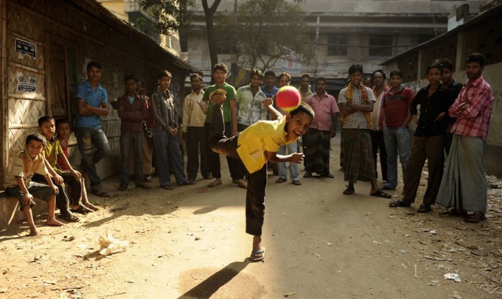 On this particular morning, down a side street I spotted a young boy throwing a ball up in the air and catching it and I began to photograph him. After a particularly high toss the ball came to rest on a roof and couldn't be retrieved. Feeling sorry for the young boy I marched off to a nearby shop and bought a replacement ball for about 40 pence, more than likely paying about twice the normal price for a tennis ball in Chittagong.