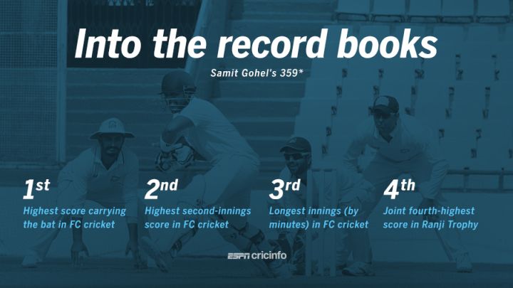 Gujarat opener Samit Gohel broke a host of first-class records during the course of his big score in the Ranji Trophy quarter-final against Odisha in Jaipur